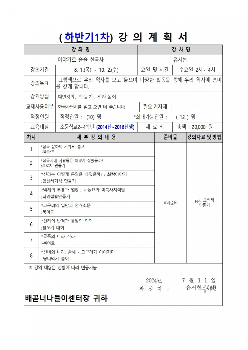 | 강좌명 | 이야기로 술술 한국사(2024년 하반기 1차 평생교육프로그램) | 접수방법 | 온라인접수(선착순) |
