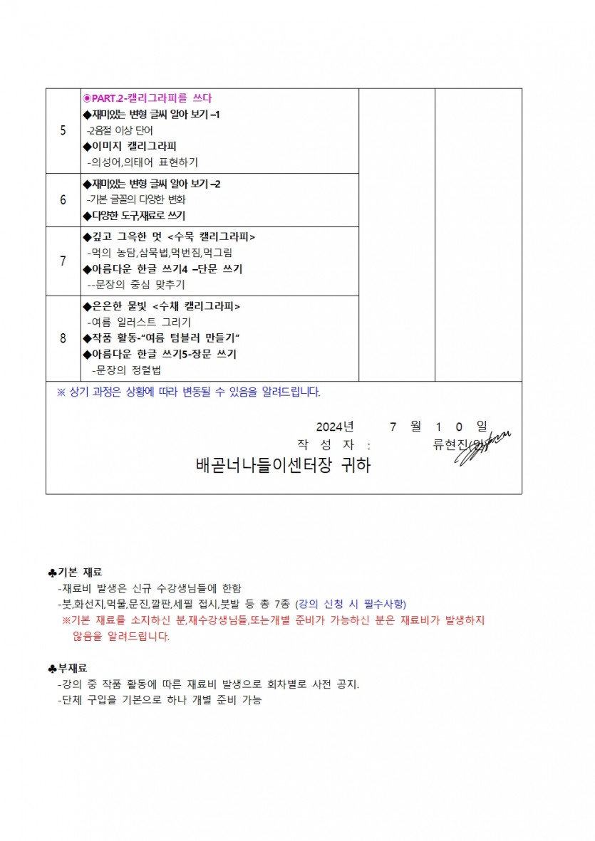 | 강좌명 | 마음을 담은 캘리그라피(2024년 하반기 1차 평생교육프로그램) | 접수방법 | 온라인접수(선착순) |