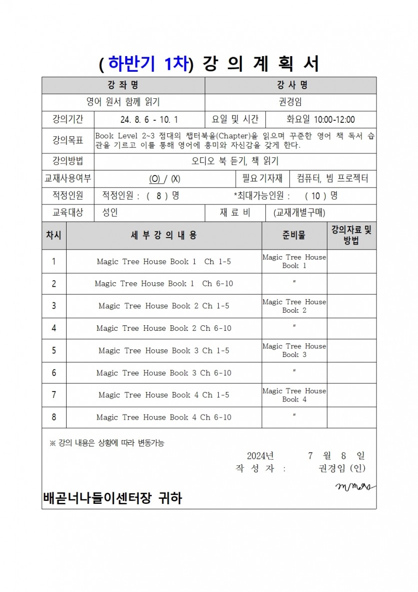 | 강좌명 | 영어 원서 함께 읽기(2024년 하반기 1차 평생교육프로그램) | 접수방법 | 온라인접수(선착순) |