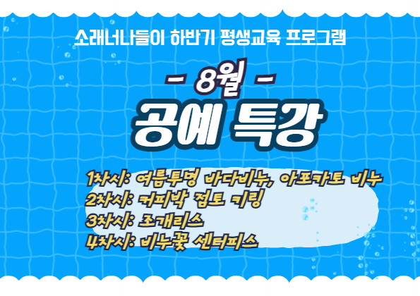 | 강좌명 | 2024년 하반기 평생교육 공예 특강 프로그램 (8월) | 접수방법 | 온라인접수(선착순) |