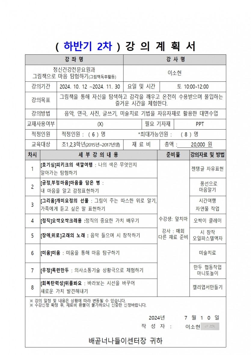 | 강좌명 | 정신건강전문요원과 그림책으로 마음 탐험하기(2024년 하반기 2차 평생교육프로그램) | 접수방법 | 온라인접수(선착순) |