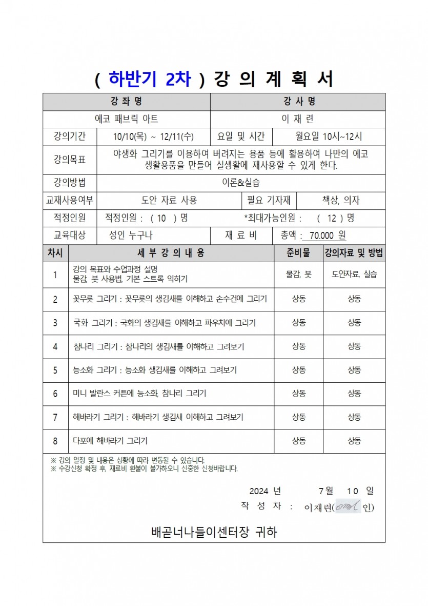 | 강좌명 | 에코 패브릭 아트(2024년 하반기 2차 평생교육프로그램) | 접수방법 | 온라인접수(선착순) |