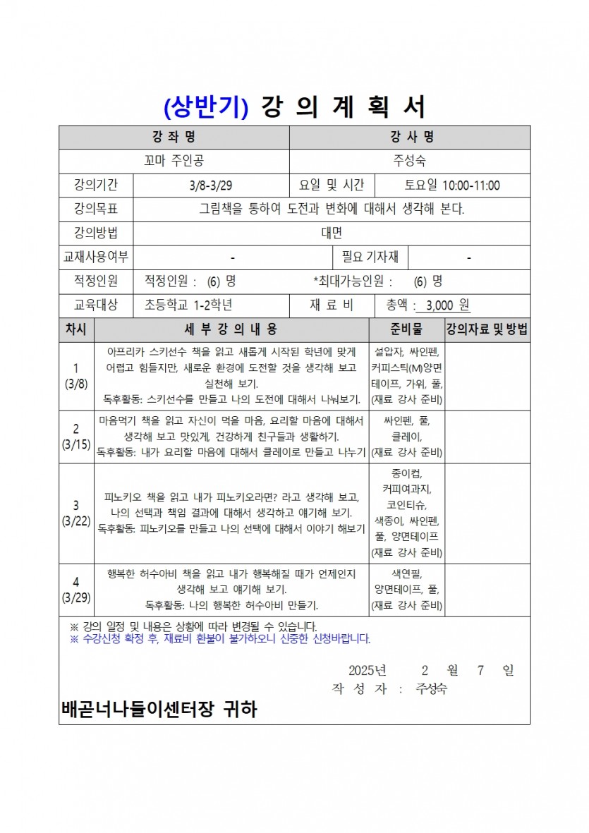 | 강좌명 | 꼬마 주인공(2025년 상반기 교육프로그램) | 접수방법 | 온라인 접수(선착순) |
