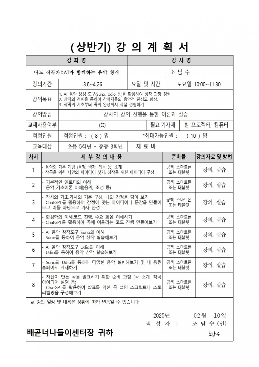 | 강좌명 | 나도 작곡가! AI와 함께하는 음악 창작(2025년 상반기 교육프로그램) | 접수방법 | 온라인 접수(선착순) |