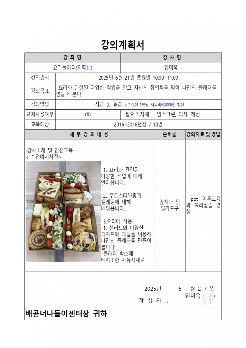 | 강좌명 | 돗자리놀이터 - 요리놀이터 저학년반 | 접수방법 | 온라인 선착순 접수 |