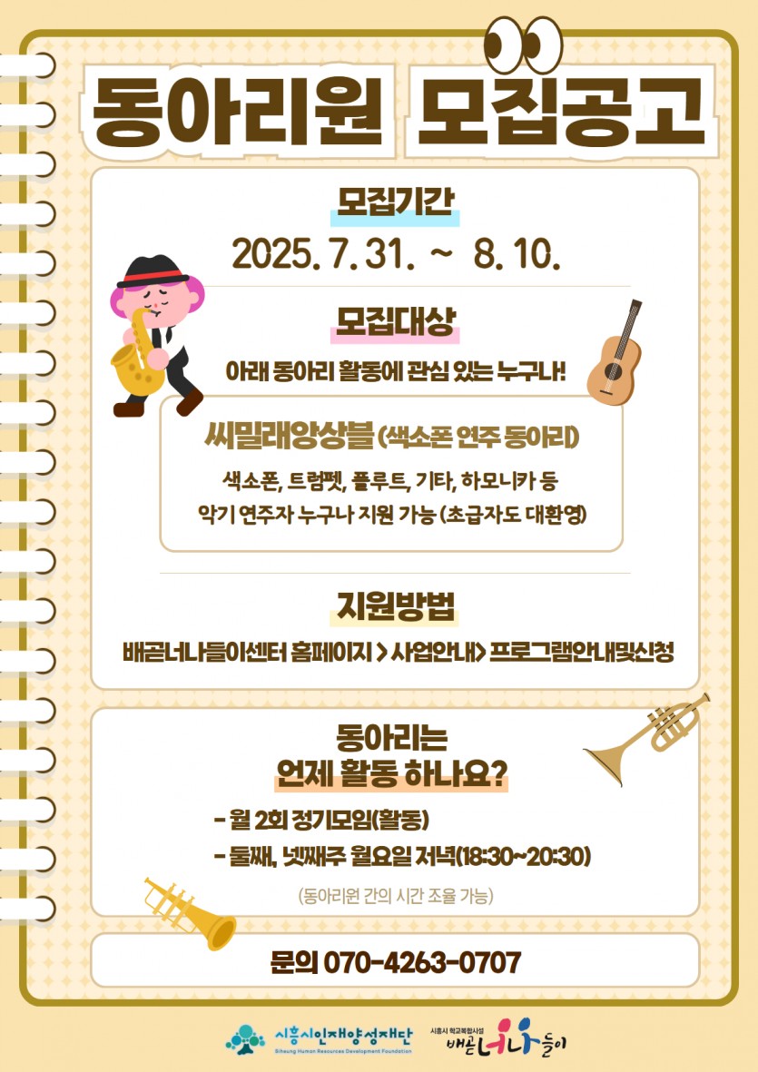 강좌명 [배곧너나들이센터 동아리원 모집] 씨밀래앙상블 접수방법 온라인 선착순 접수