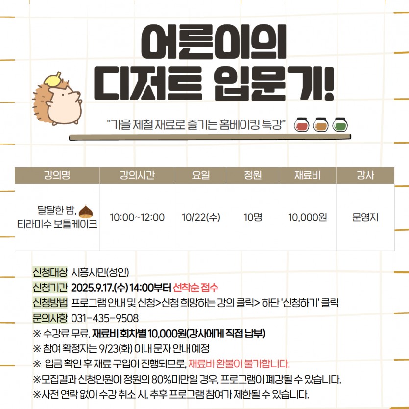 강좌명 달달한 밤, 티라미수 보틀케이크-2025년 하반기 지역맞춤 특강프로그램 접수방법 온라인접수(선착순)