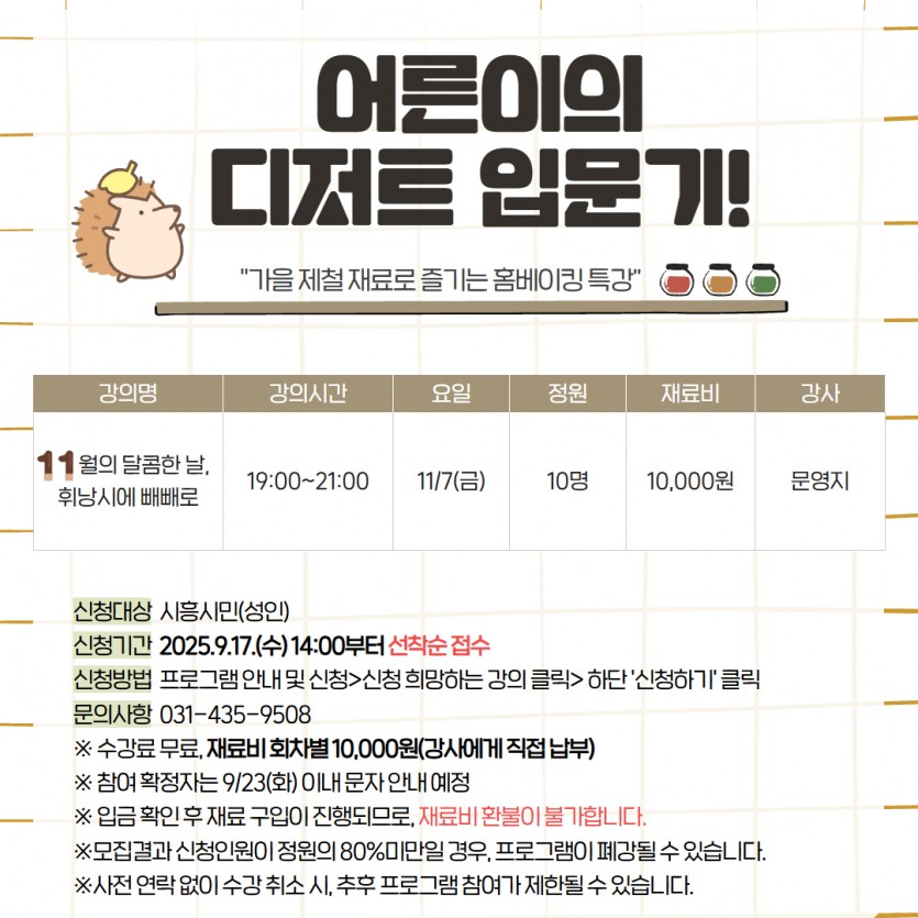 | 강좌명 | 11월의 달콤한 날, 휘낭시에 빼빼로 -2025년 하반기 지역맞춤 특강프로그램 | 접수방법 | 온라인접수(선착순) |