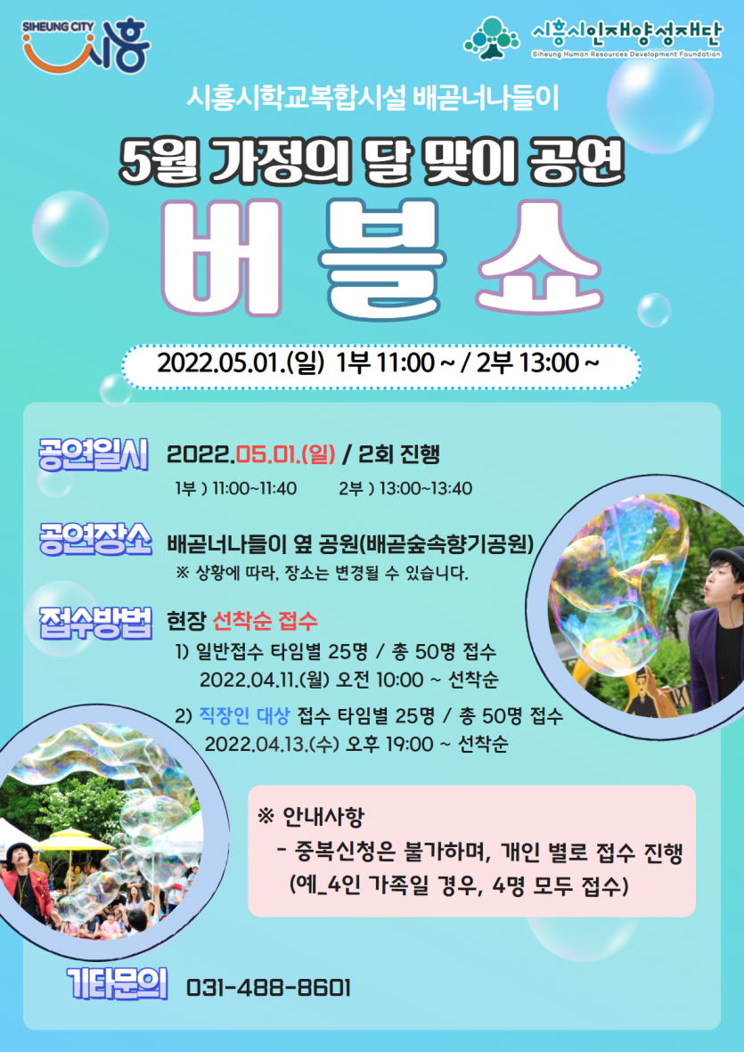 강좌명 배곧너나들이 5월 가정의 달 맞이 공연 버블쇼 신청 안내 접수방법 현장접수(배곧너나들이) - 선착순