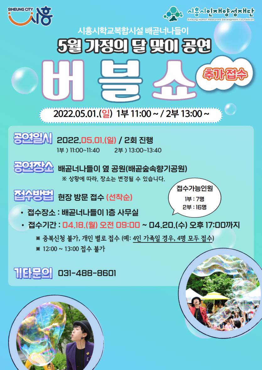 강좌명 배곧너나들이 5월 가정의 달 맞이 공연 버블쇼 추가 접수 안내 접수방법 현장접수(배곧너나들이)