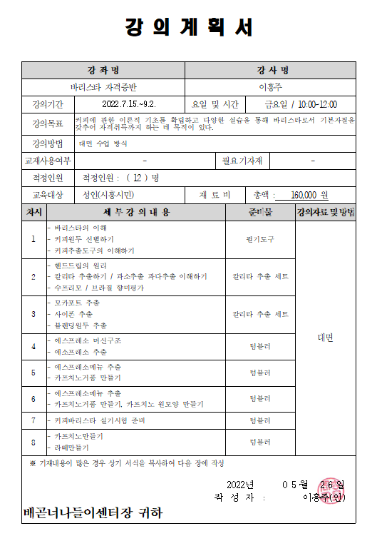 강좌명 3분기 교육프로그램 - 바리스타 자격증 접수방법 온라인 신청(선착순 접수)