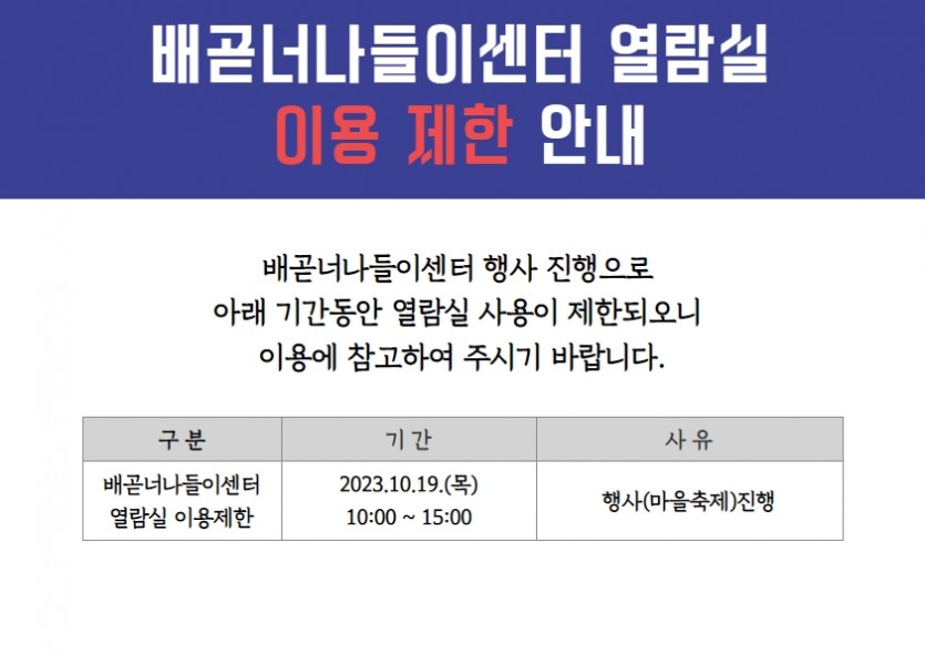 [안내] 배곧너나들이센터 열람실 이용제한 안내(10/19)