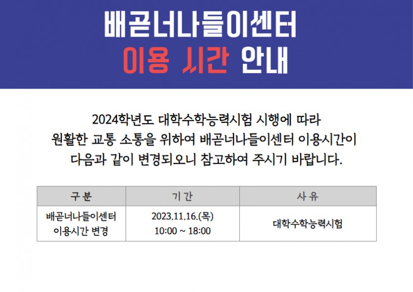 [공지] 배곧너나들이센터 이용시간 안내(11/16)