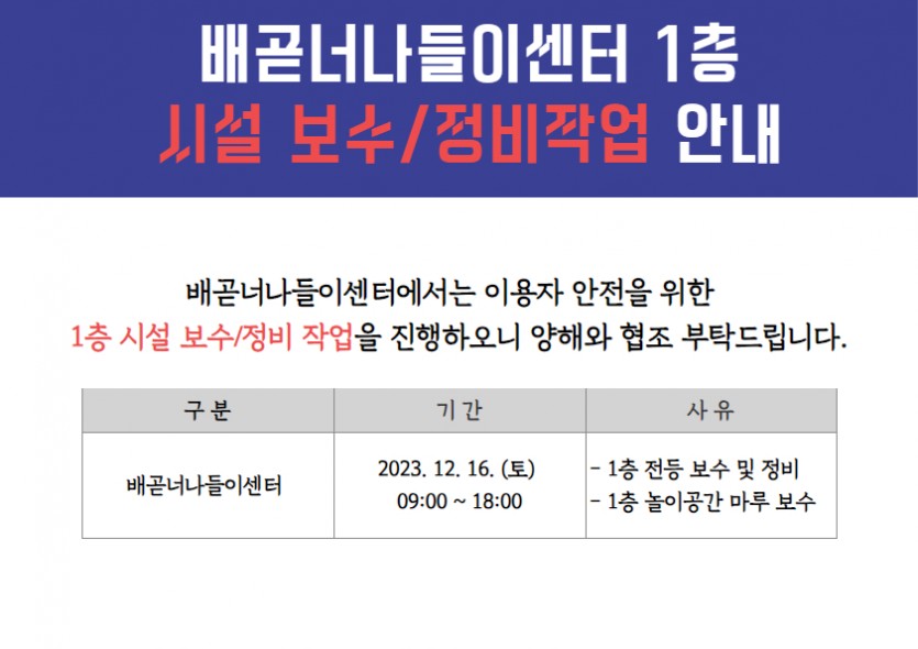 [공지] 배곧너나들이센터 시설 보수작업 안내(12/16)