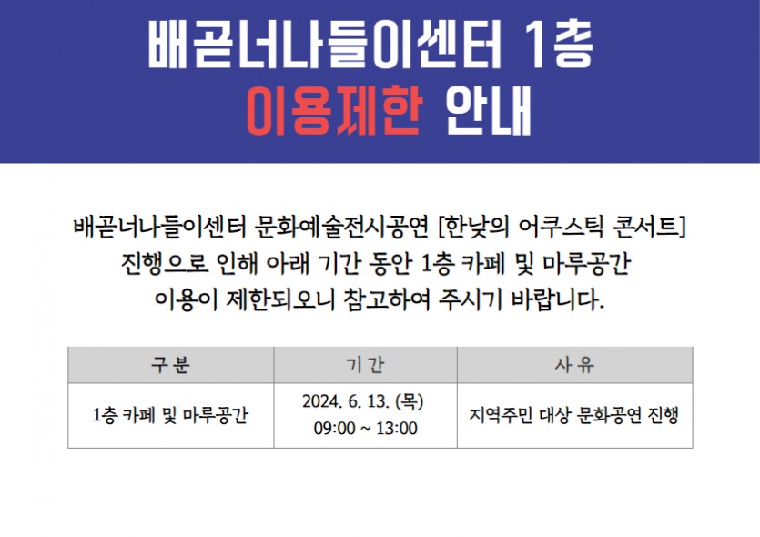 [공지] 배곧너나들이센터 1층 이용제한 안내(6/13)