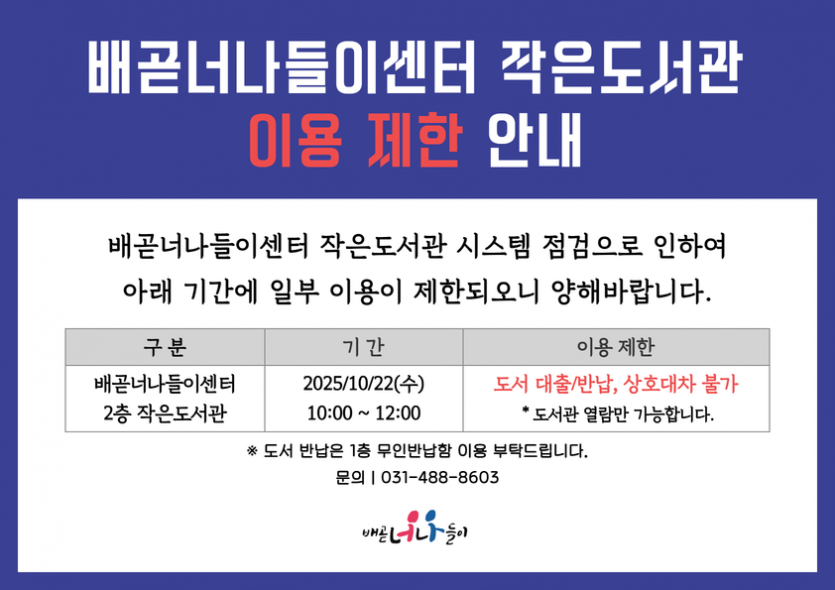 [공지] 배곧너나들이센터 작은도서관 이용 제한 안내(10/22)