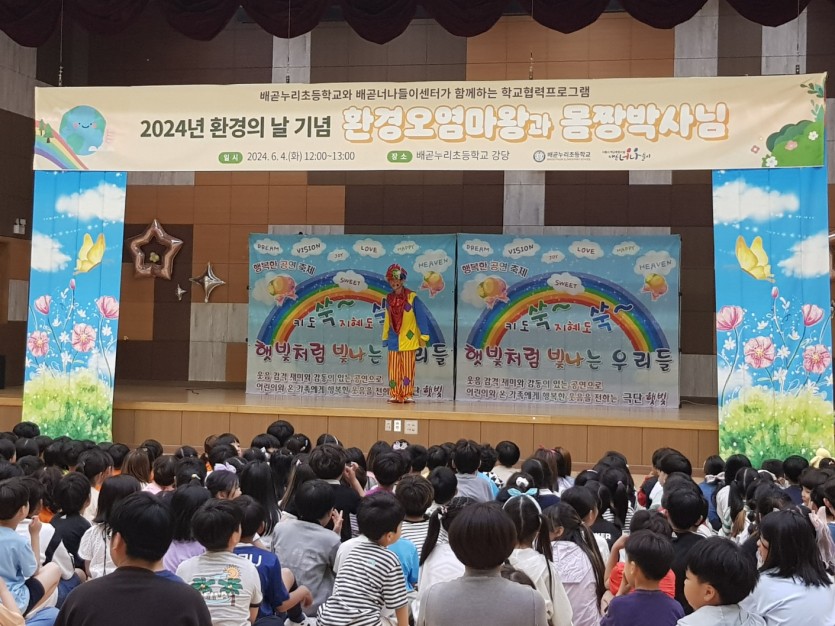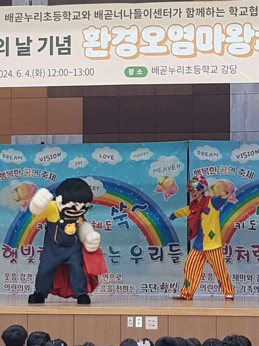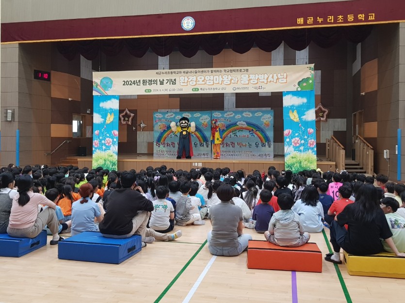 환경의 날 기념으로 배곧누리초 1~2학년 학생들과 함께 환경뮤지컬 '환경오염마왕과 몸짱박사님' 문화공연을 관람하였습니다.