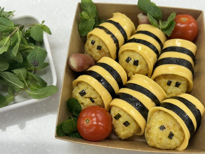 밥에 마요네즈와 카레가루를 넣어 꿀벌처럼 노랗고 귀여운 색을 표현하고,