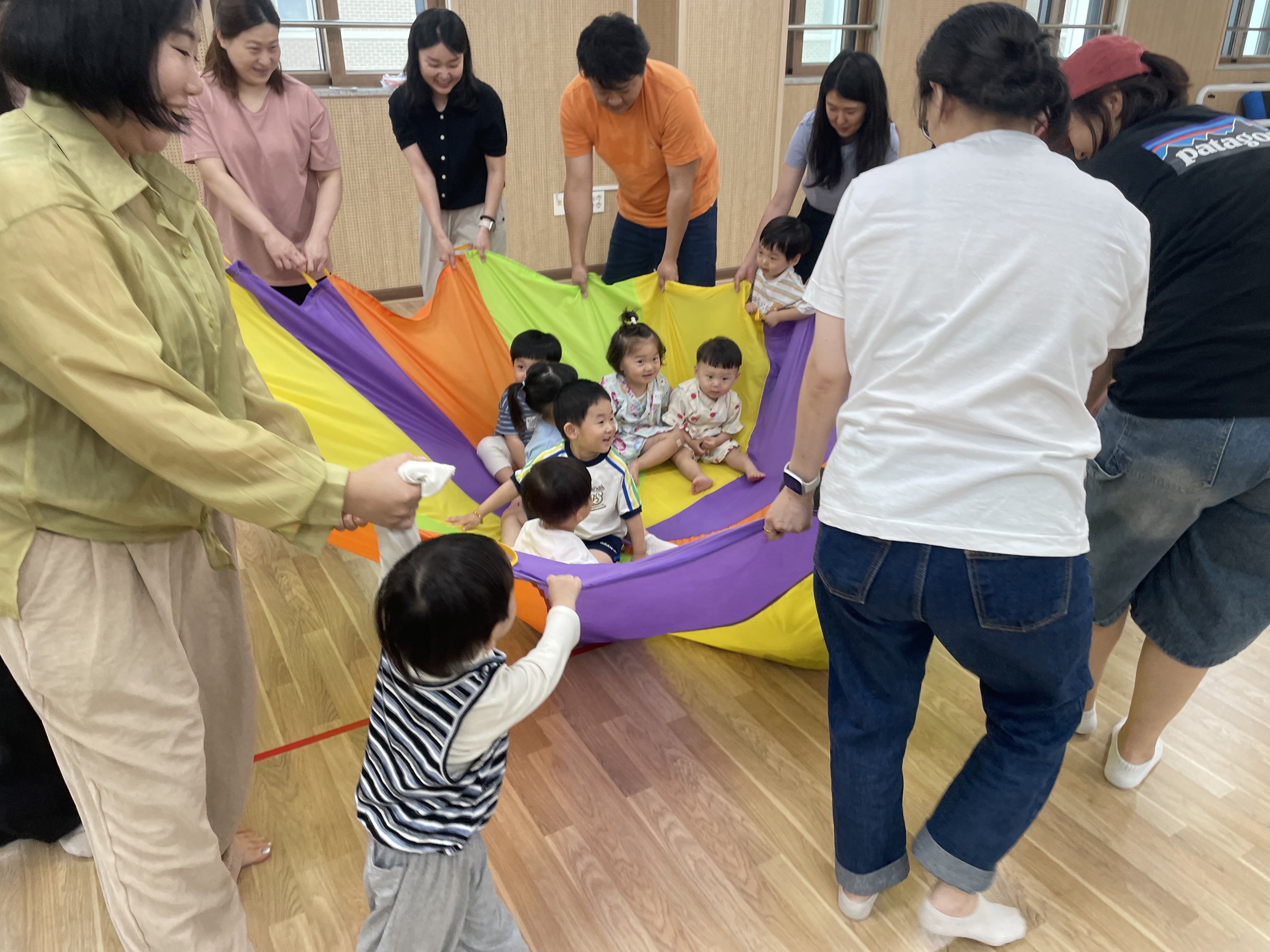 클래식 음악에 맞추어 낙하산의 펄럭임과 바람을 느끼며 엄마아빠와 친구들과 교감 쌓기도 했어요