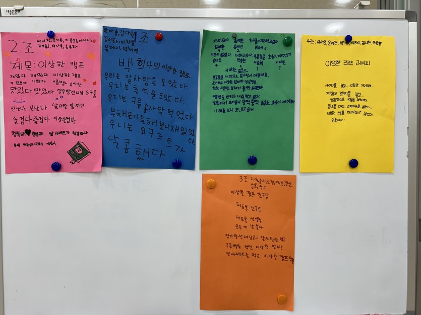 '한여름밤의 이상한 캠프'에서 느낀 소감을 동시로 표현하는 시간이었는데, 조마다 저마다의 색깔이 담긴 기발하고 따뜻한 작품들이 쏟아졌습니다.