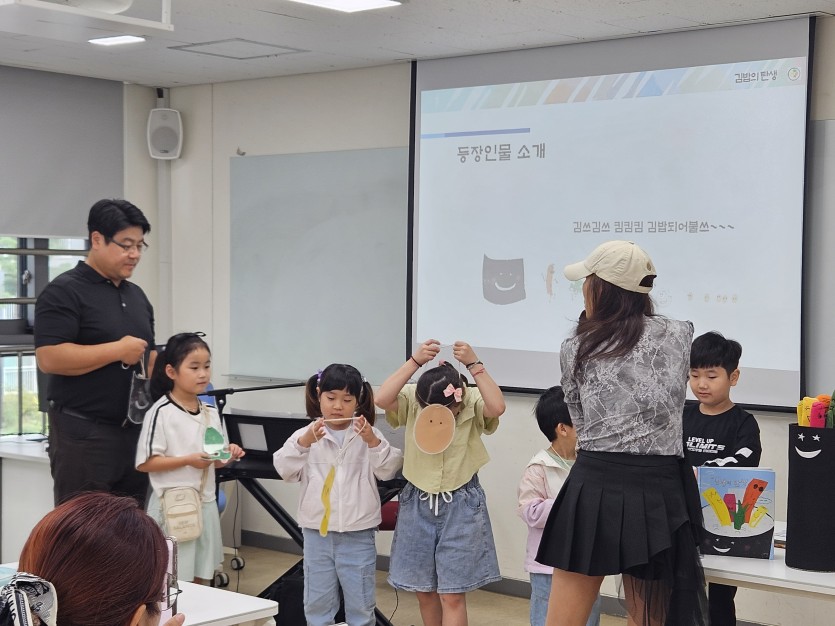 그림책 '김밥의 탄생' 속 캐릭터 역할을 정한 후, 작가님의 피아노 연주에 맞춰 낭독하는 시간입니다!