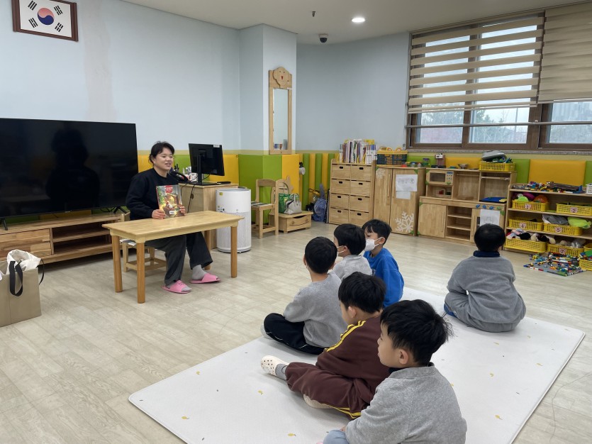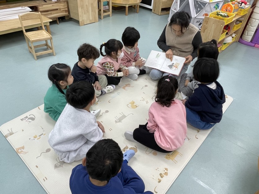 오순도순 모여 앉아 <쿠키 한 입의 행복> 을 읽는 5세반 친구들