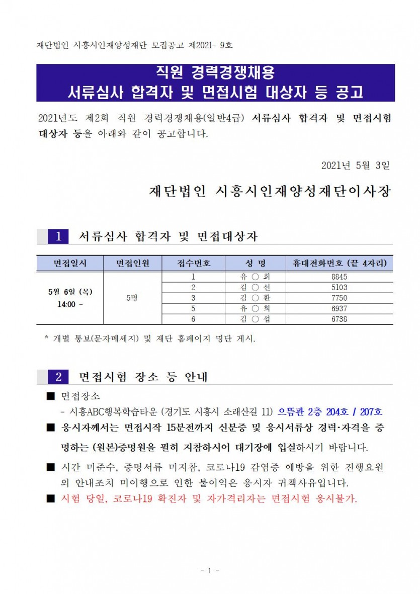 [공고] 2021년도 제2회 직원 경력경쟁채용 서류심사 합격자 및 면접시험 대상자 등 공고