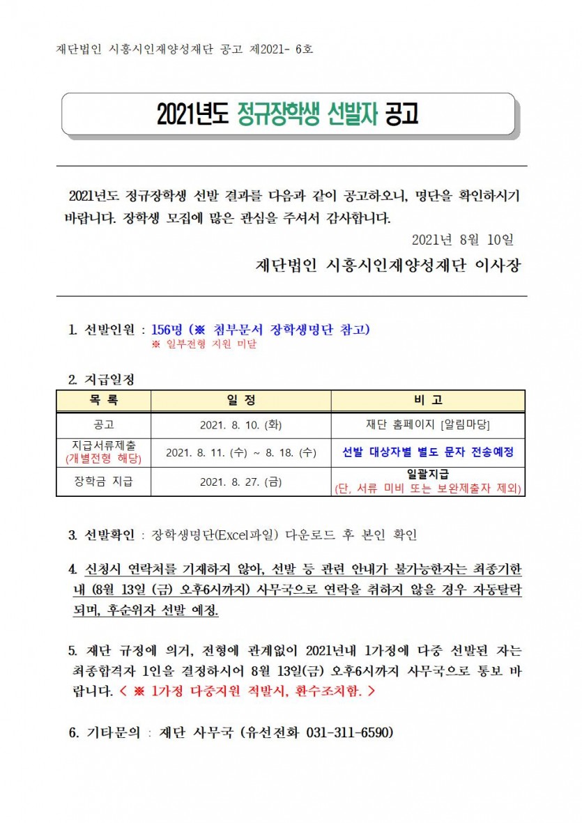 공고 제2021-6호. 2021년도 정규장학생 선발자 공고.hwp