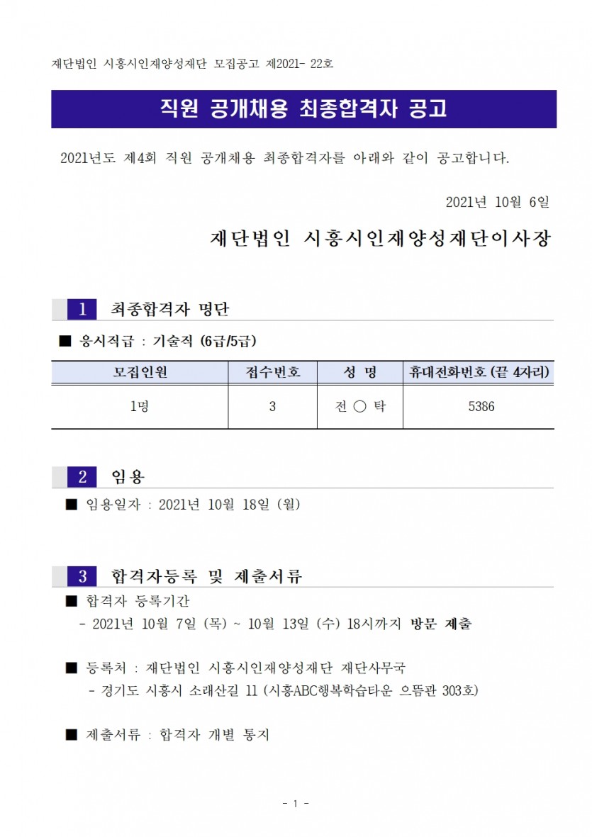 [채용] 2021년 제4회 직원 공개채용 최종합격자 공고