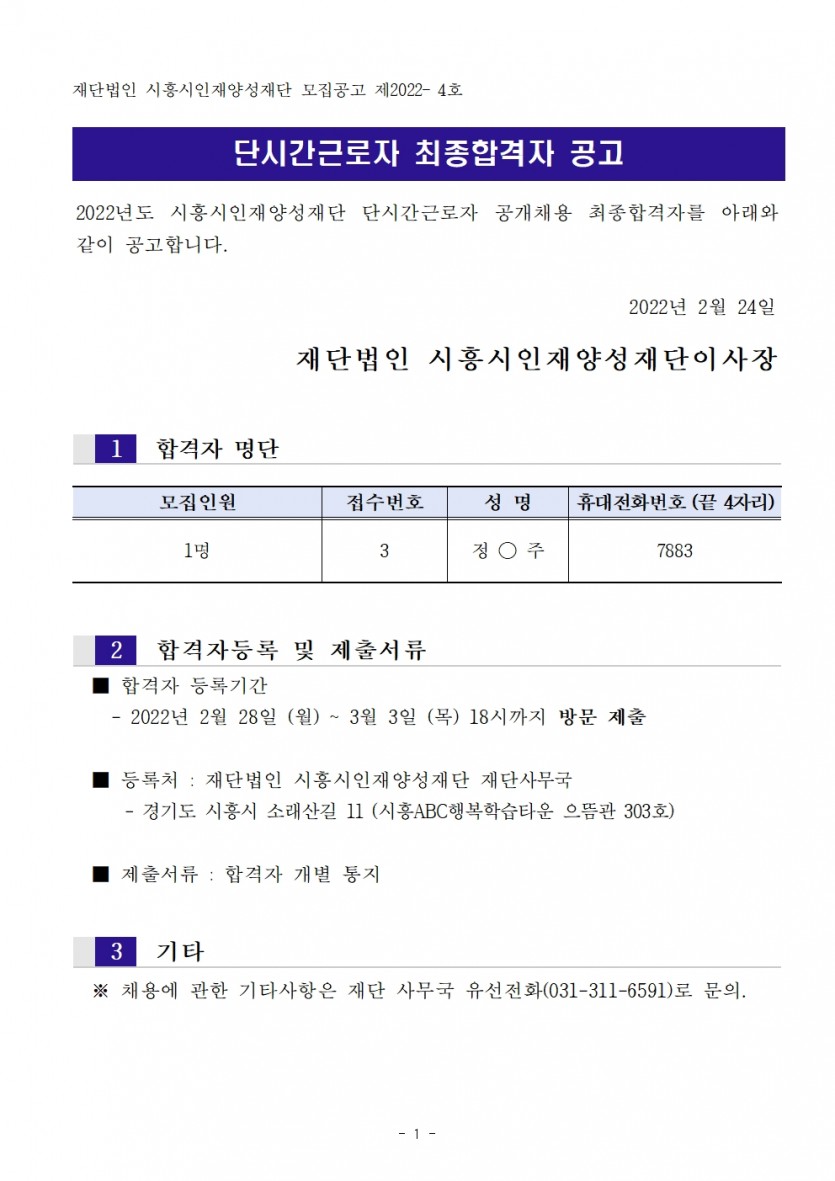 [채용] 단시간근로자 최종합격자 공고