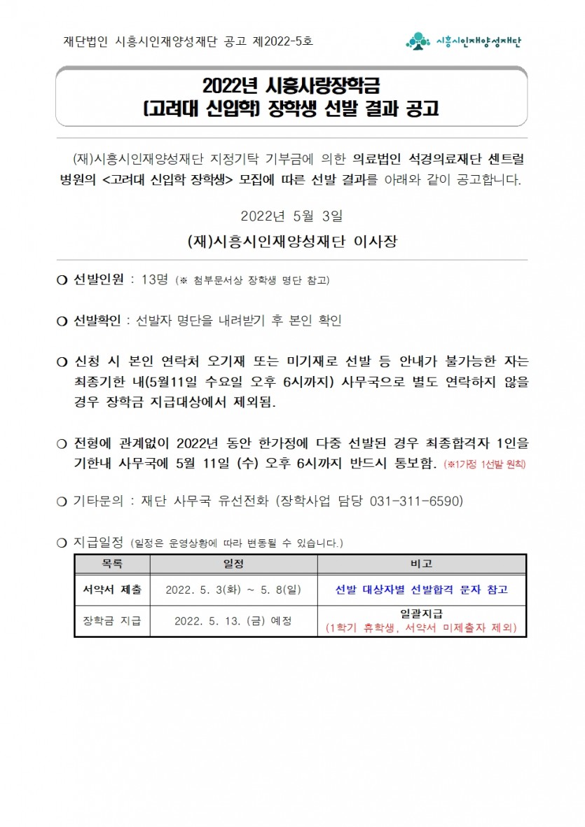 2022-5호. 2022년 시흥사랑장학금(고려대 신입학) 장학생 선발 결과 공고.hwp