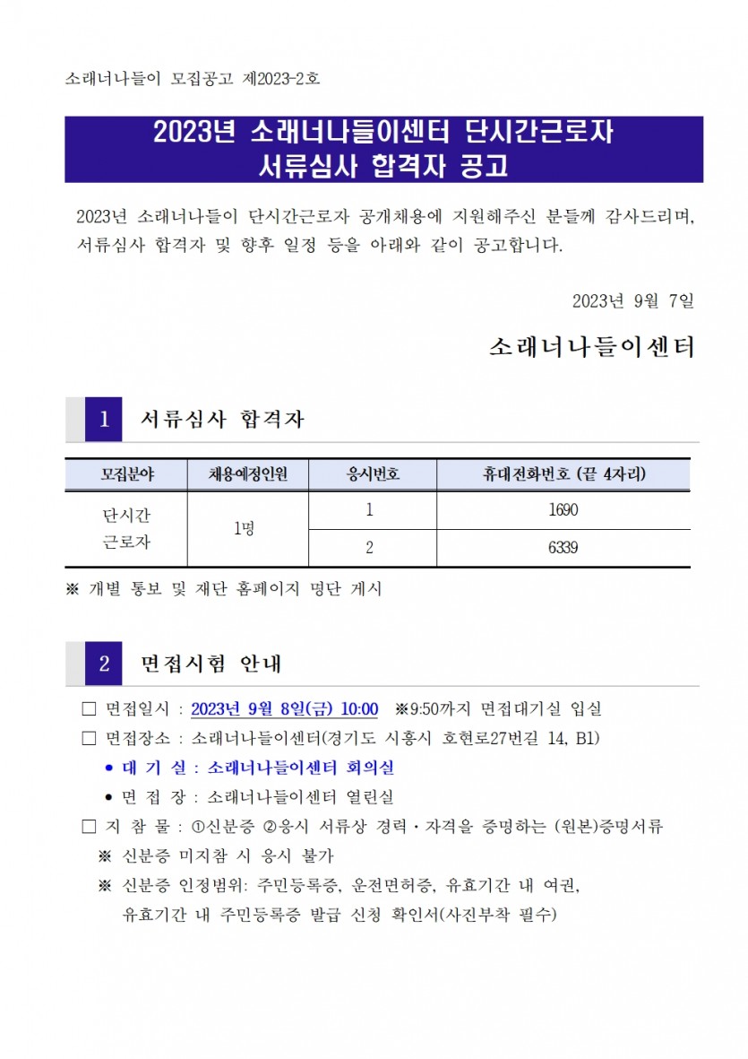[채용] 2023년 소래너나들이센터 단시간근로자 서류심사 합격자 공고