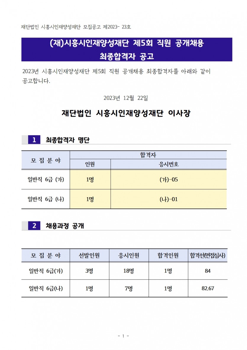 [채용] 2023년 제5회 직원 공개채용 최종합격자 공고