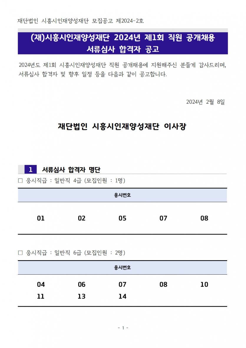 2024년 제1회 직원 공개채용 최종합격자 공고
