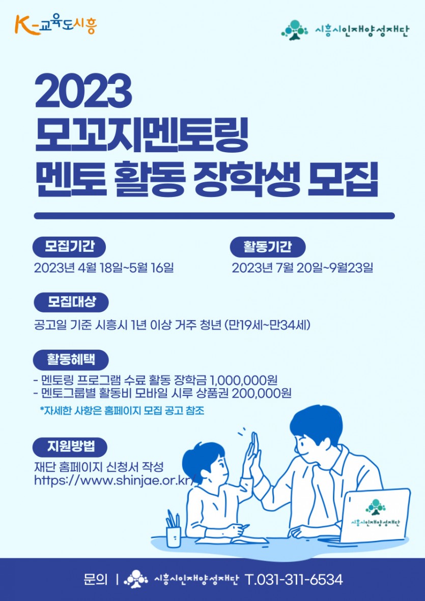 모꼬지 멘토링 관련 문의는 시흥시인재양성재단 사무국(031-311-6534, phanah@shinjae.or.kr)으로 하면 된다.