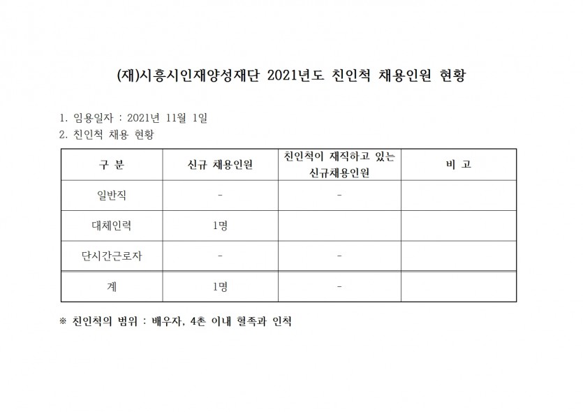 [친인척 채용인원 공개] 2021년도 신규채용 관련 임직원 친인척 현황 공시 (11월)