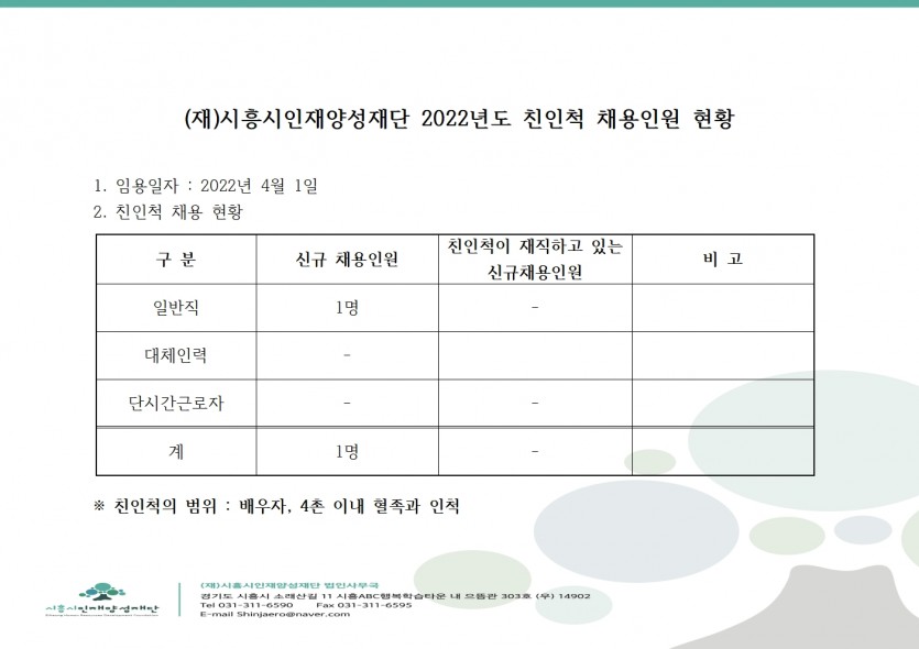 [친인척 채용인원 공개] 2022년도 신규채용 관련 임직원 친인척 현황 공시 (4월)