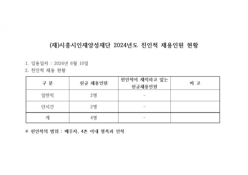 [친인척 채용인원 공개] 2024년 신규채용 관련 임직원 친인척 현황 공시(6월)