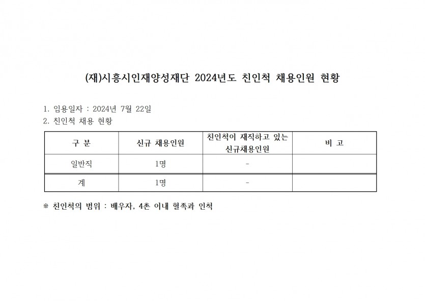 [친인척 채용인원 공개] 2024년 신규채용 관련 임직원 친인척 현황 공시(7월)