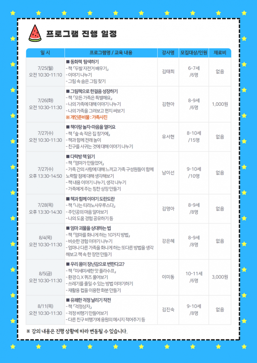 | 강좌명 | 배곧너나들이 여름방학 프로그램 안내 | 접수방법 | 온라인 신청(선착순) |