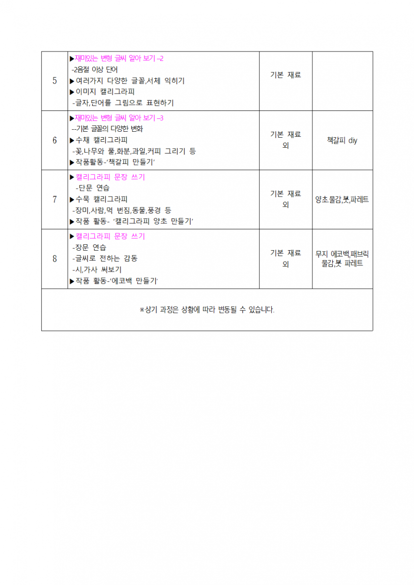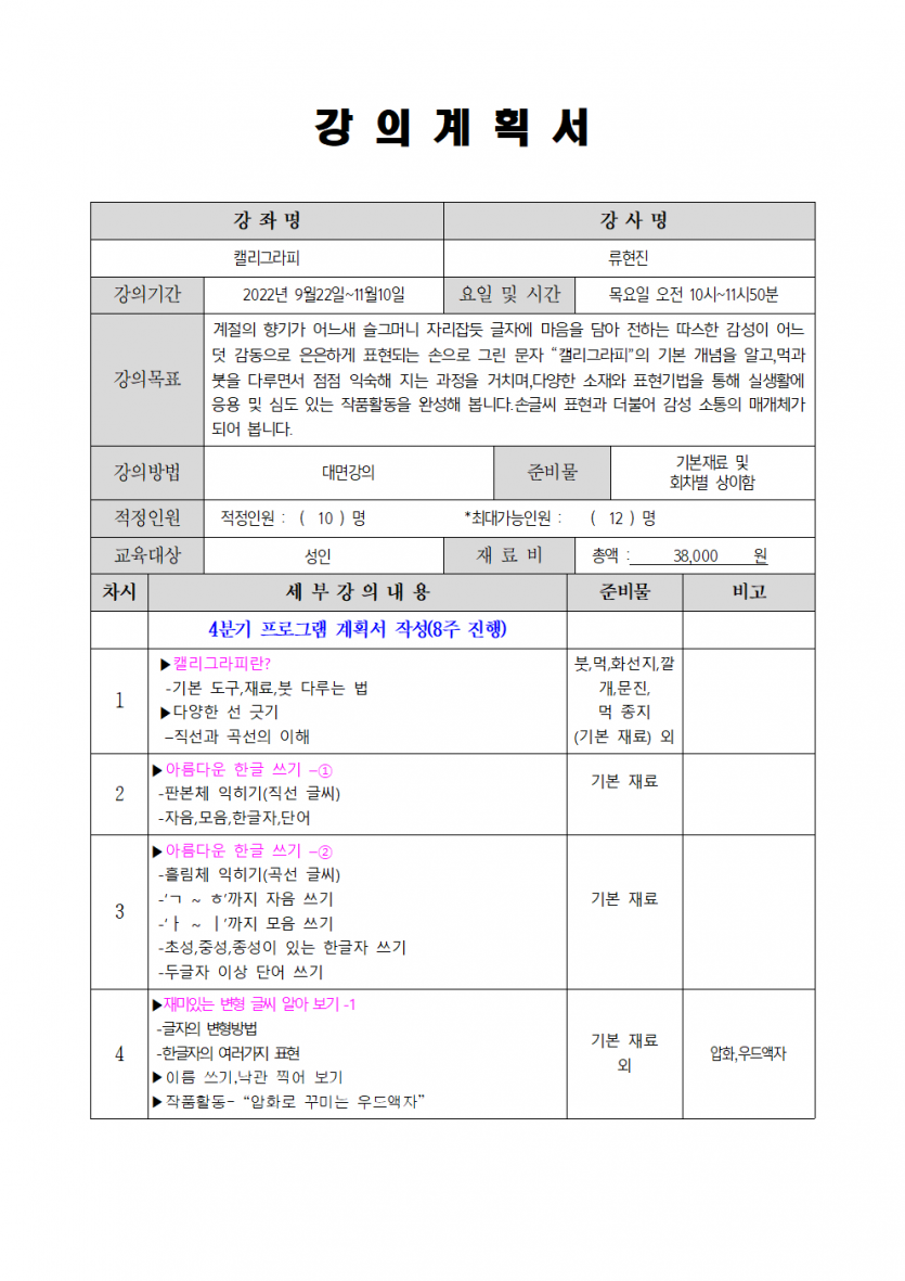 | 강좌명 | 4분기 교육프로그램 - 캘리그라피 | 접수방법 | 온라인 신청(선착순 접수) |