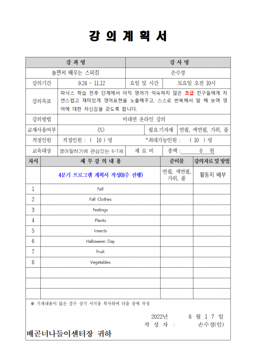 | 강좌명 | 4분기 교육프로그램 - 놀면서 배우는 스피킹 | 접수방법 | 온라인 신청(선착순 접수) |