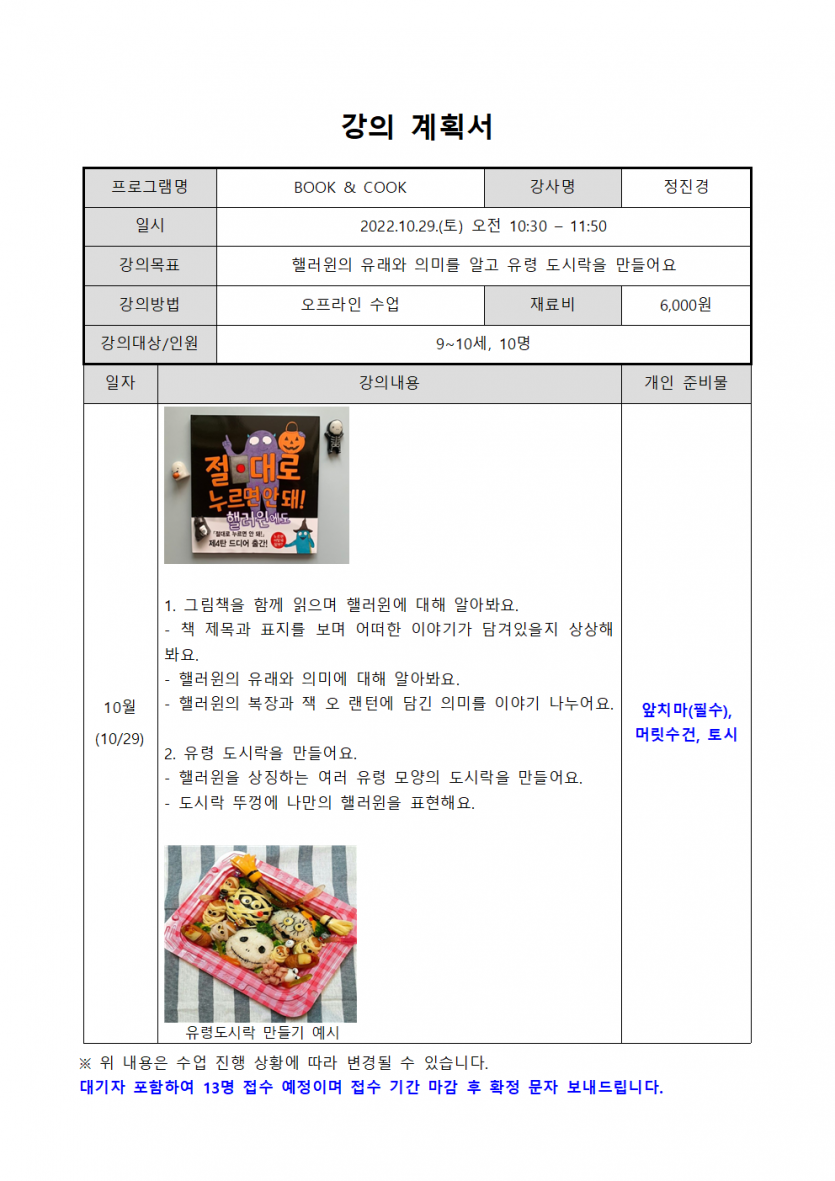 강좌명 10월 토요교실 프로그램 - BOOK&COOK(9-10세) 접수방법 온라인 신청(선착순)