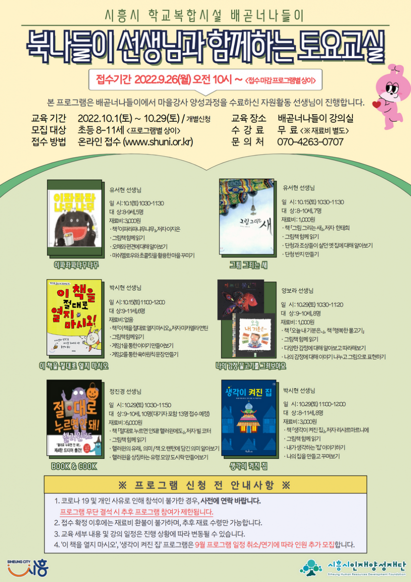 | 강좌명 | 10월 북나들이 선생님과 함께하는 토요교실 안내 | 접수방법 | 온라인 신청(선착순) |