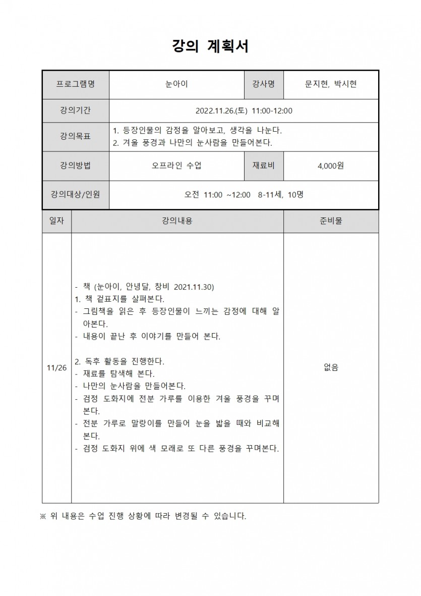 11월 북나들이 프로그램 - 눈아이(8-11세)