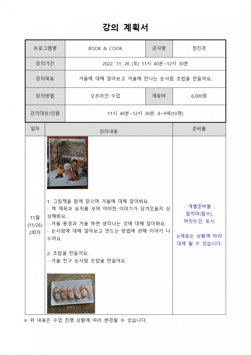 11월 북나들이 프로그램 - 요리COOK! 조리COOK!(5-6세)