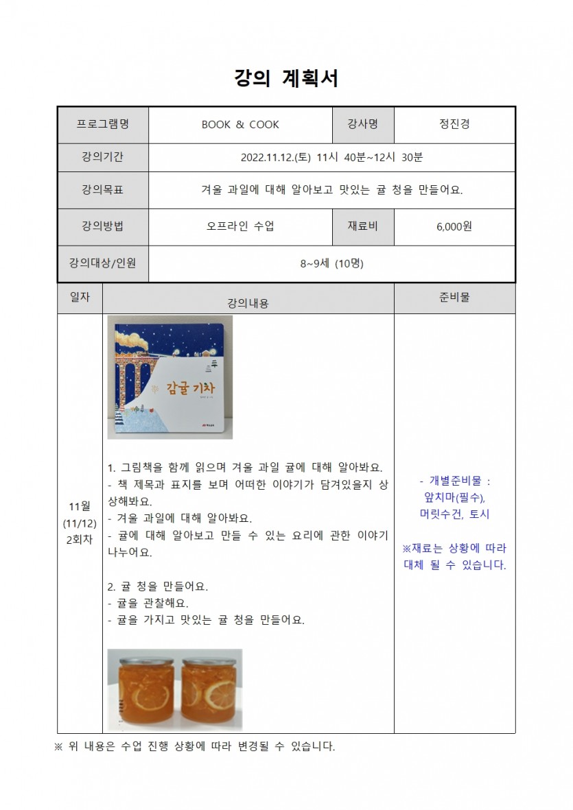 11월 북나들이 프로그램 - BOOK&COOK(8-9세)