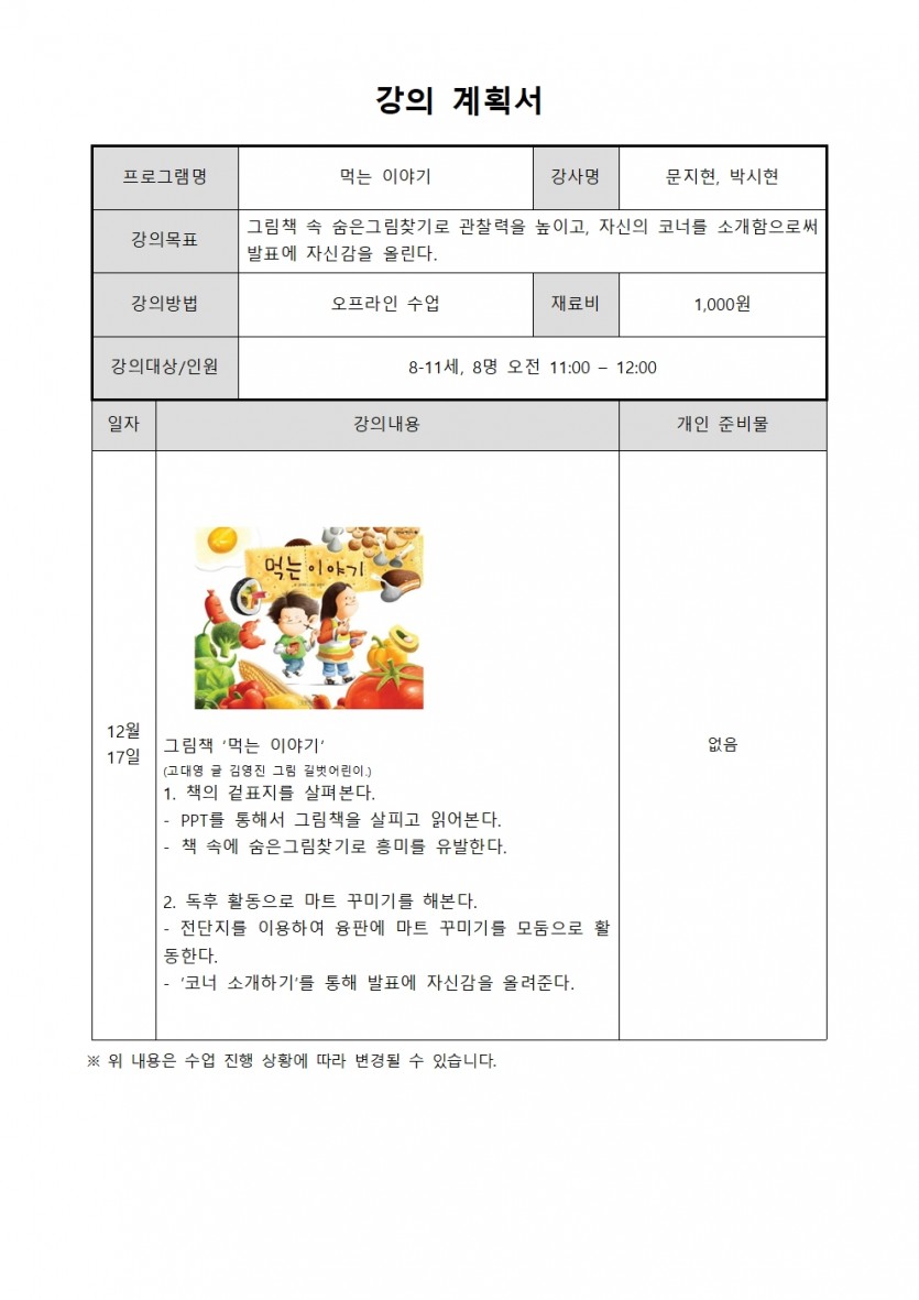 12월 17일 북나들이 프로그램 - 먹는 이야기(8-11세)
