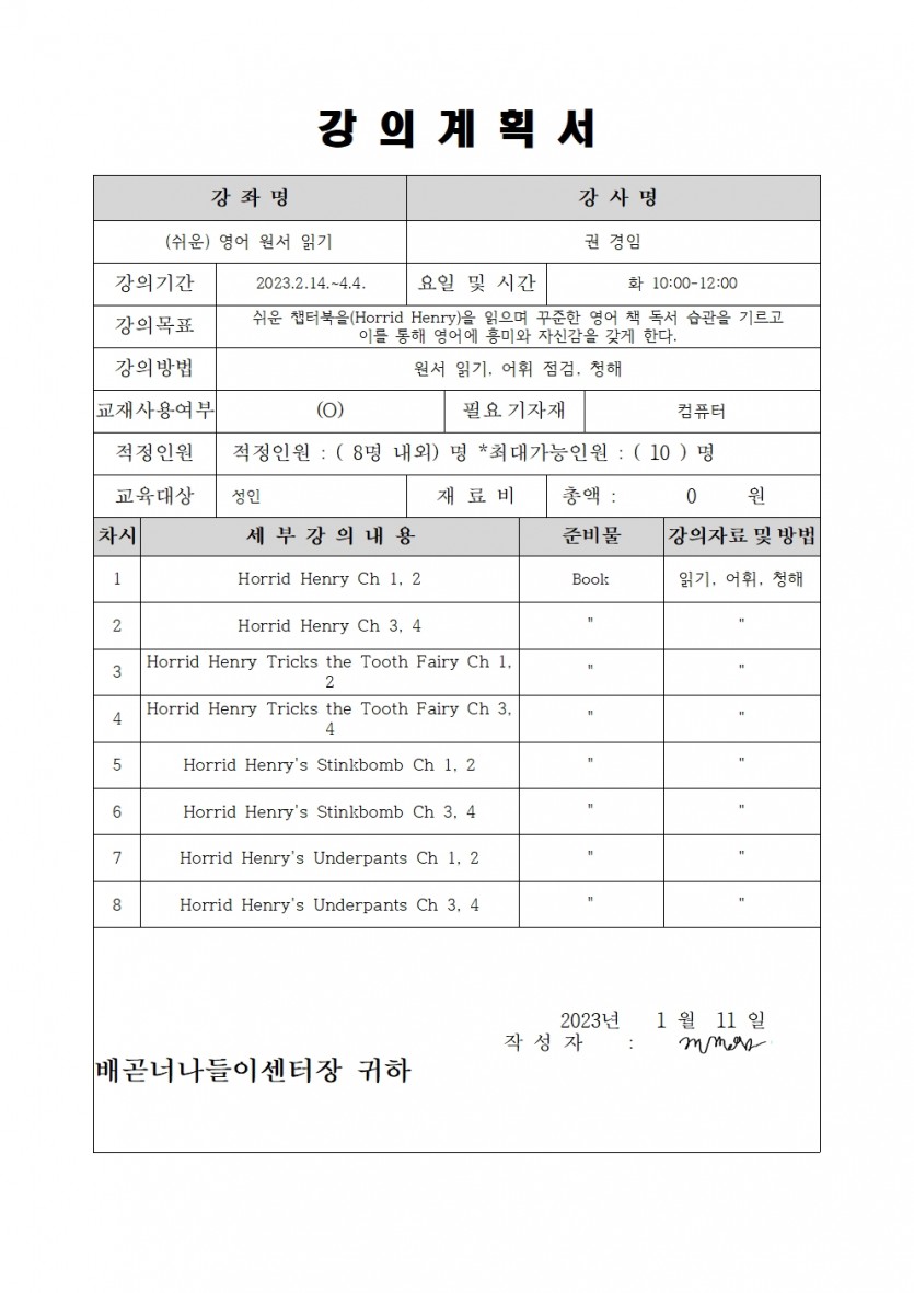 | 강좌명 | 2023년 1분기 평생교육프로그램 - 영어원서 쉽게읽기 | 접수방법 | 온라인 접수(선착순) |