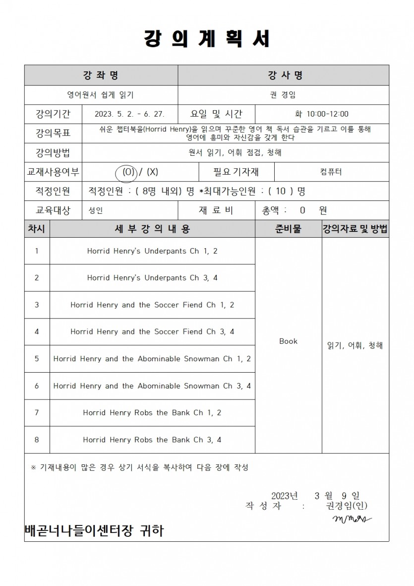 | 강좌명 | 2023년 2분기 평생교육프로그램 - 영어원서 쉽게 읽기 | 접수방법 | 온라인 접수(선착순) |